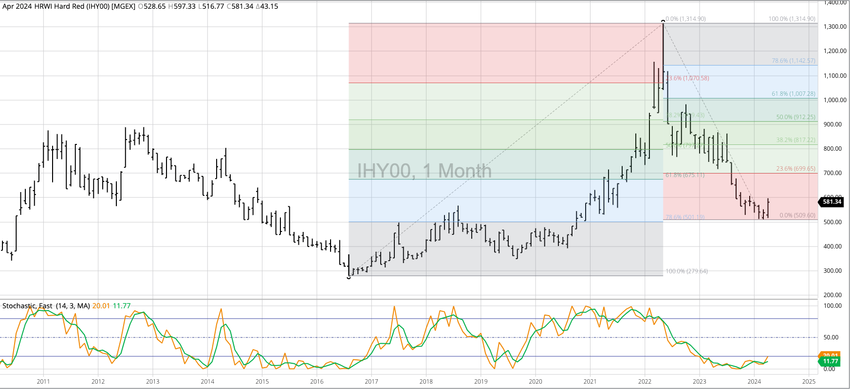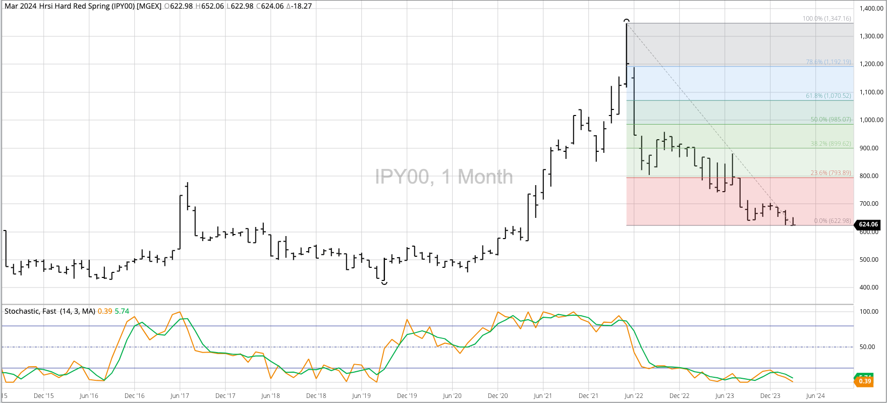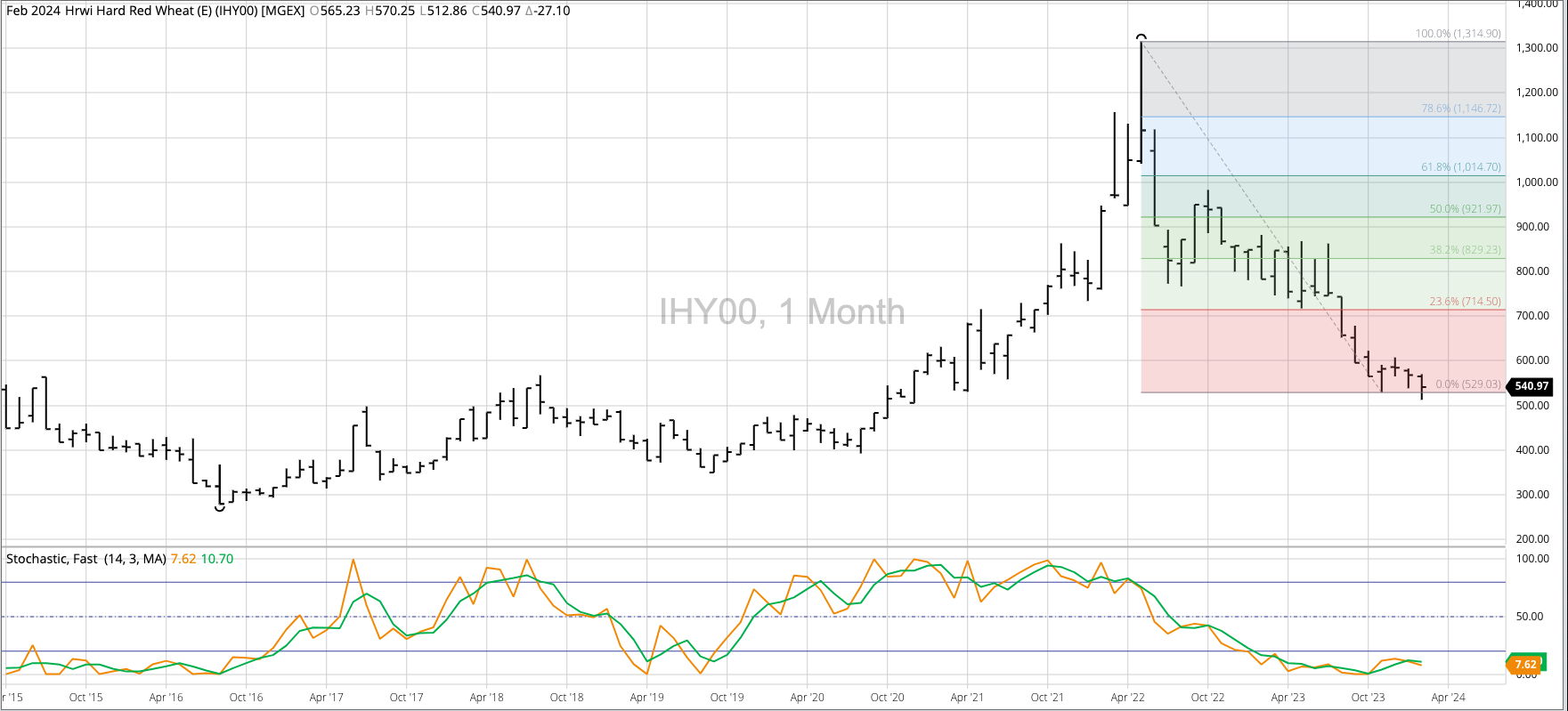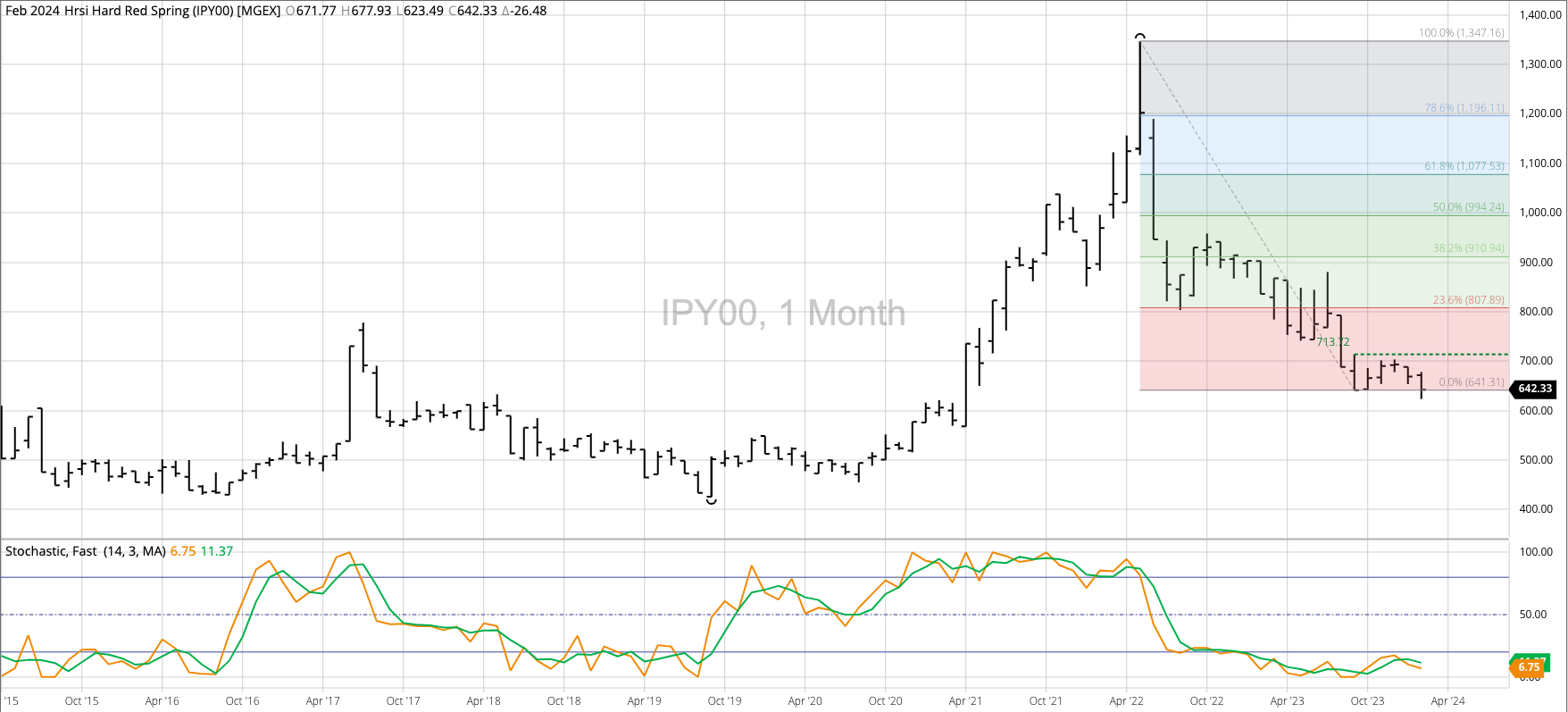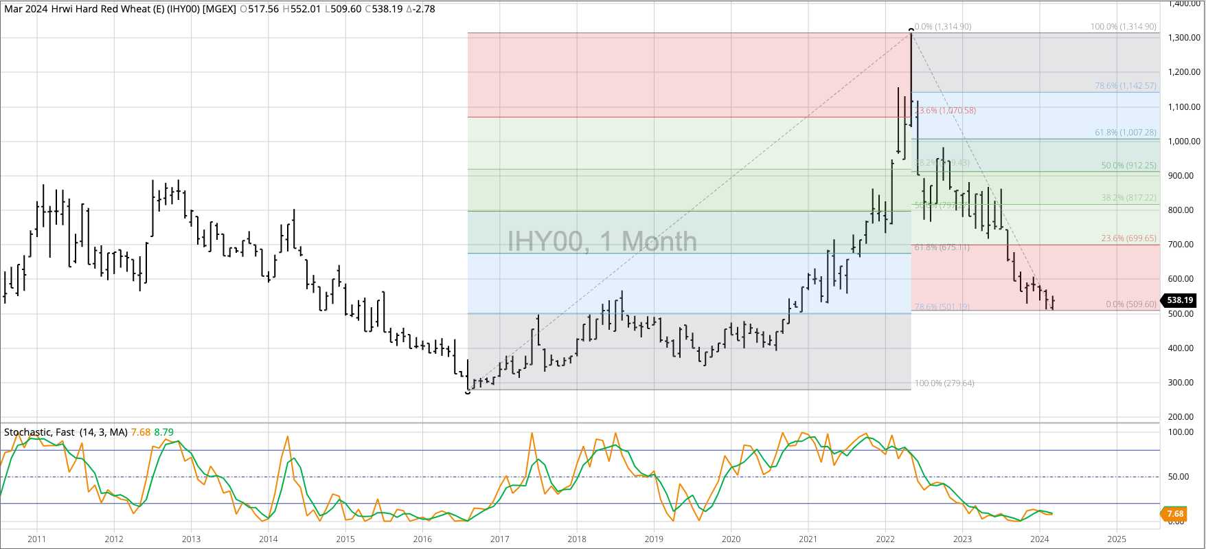 The HRW Wheat Price Index (IHY00, national average cash price) fell to a new low of $5.1286 during February, erasing the bullish spike reversal from November 2023 that included a [...]