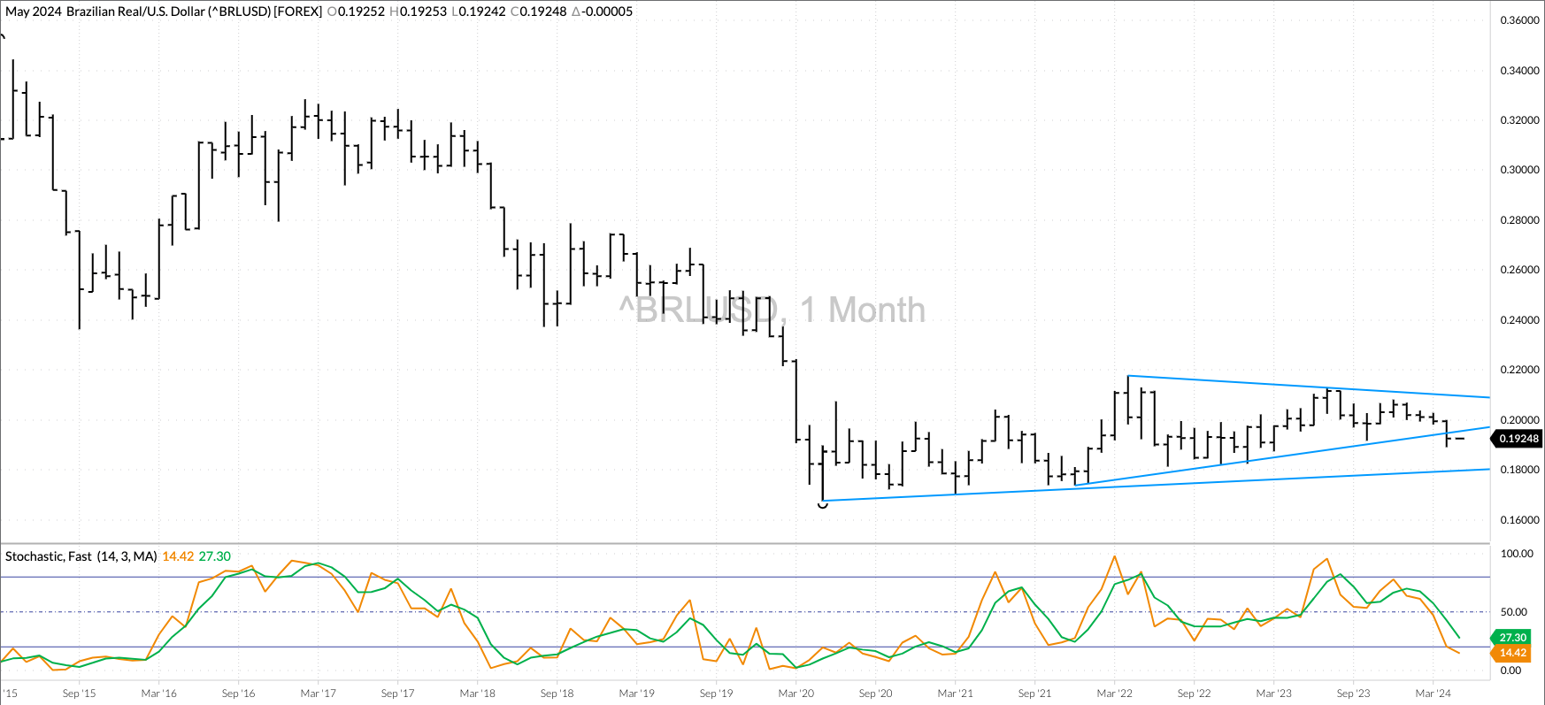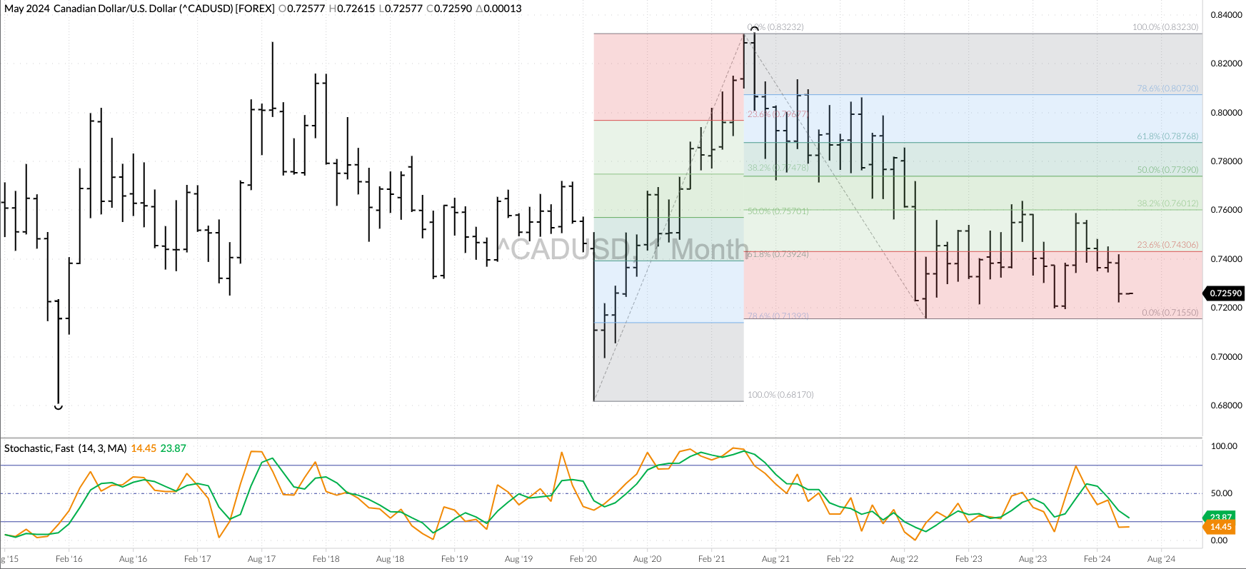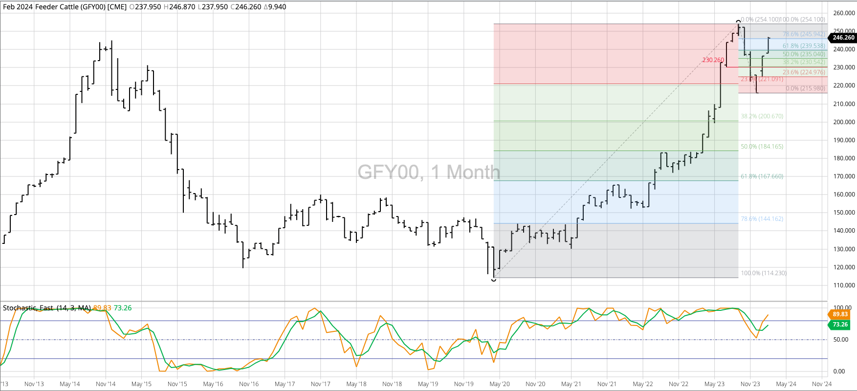 Live Cattle (continuous, nearby futures) extended its major (long-term) downtrend during April with the nearby futures contract hitting a low of $174.20. The initial downside target is near $148.70, the [...]