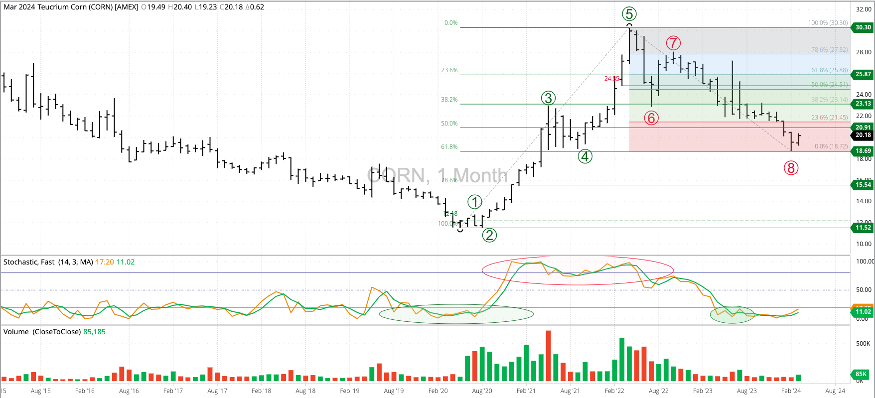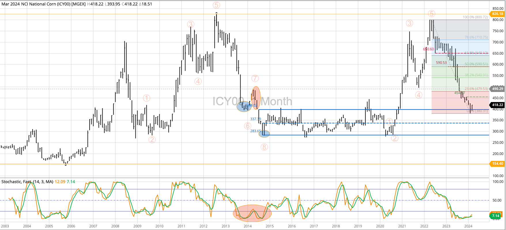 Corn Cash Index: The National Corn Price Index (NCI, national average cash price) extended its major (long-term) downtrend to a low of $3.8031 during February before closing at $3.9971, down [...]