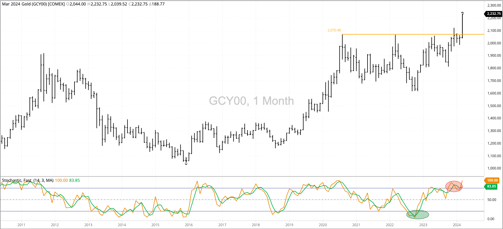 Gold (Cash Index): The cash index (GCY00) extended its major (long-term) uptrend to a high of $2,232.75 before closing March at that mark. The market is sharply overbought, but this [...]