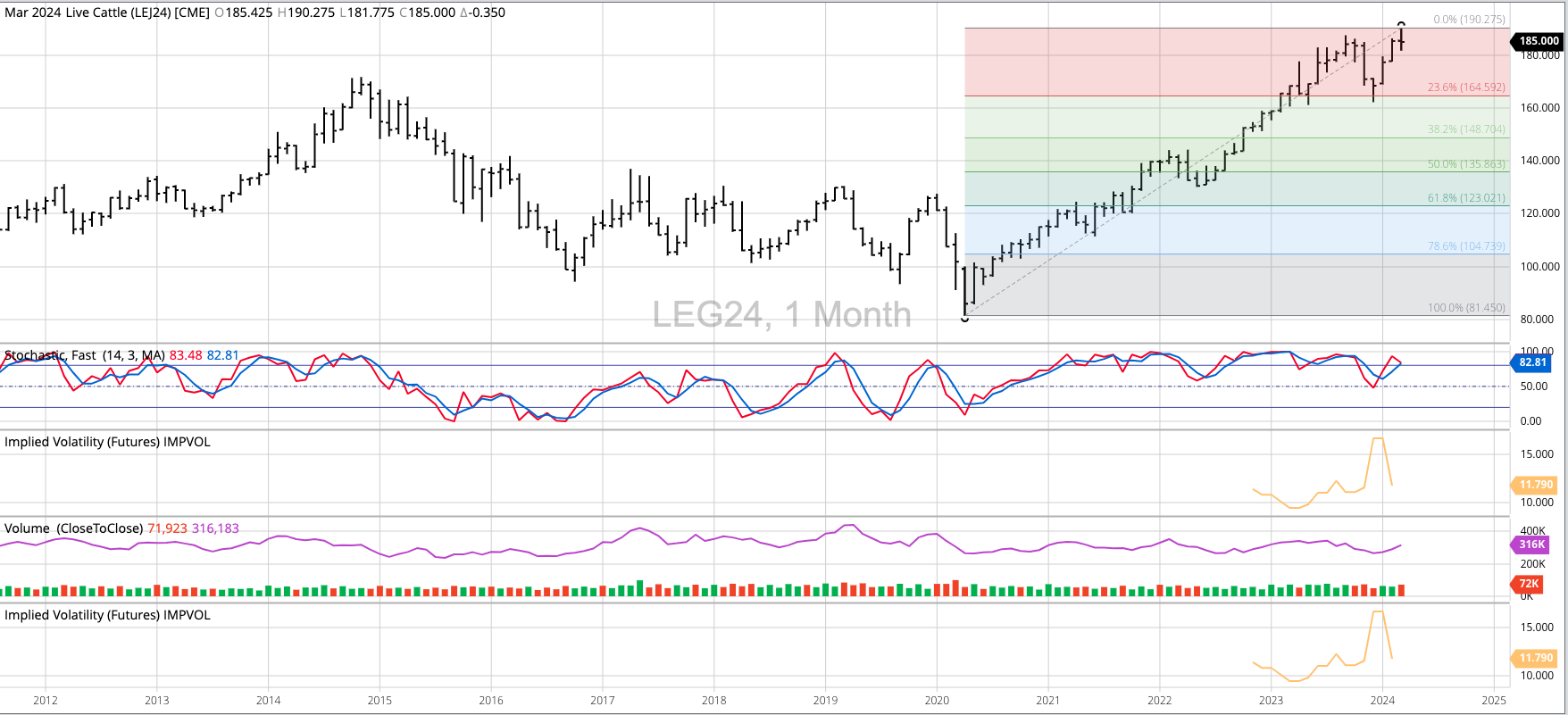Live Cattle (continuous, nearby futures) look to have rolled into a major (long-term) downtrend at the end of March. The nearby April futures contract posted a high of $190.275 before [...]