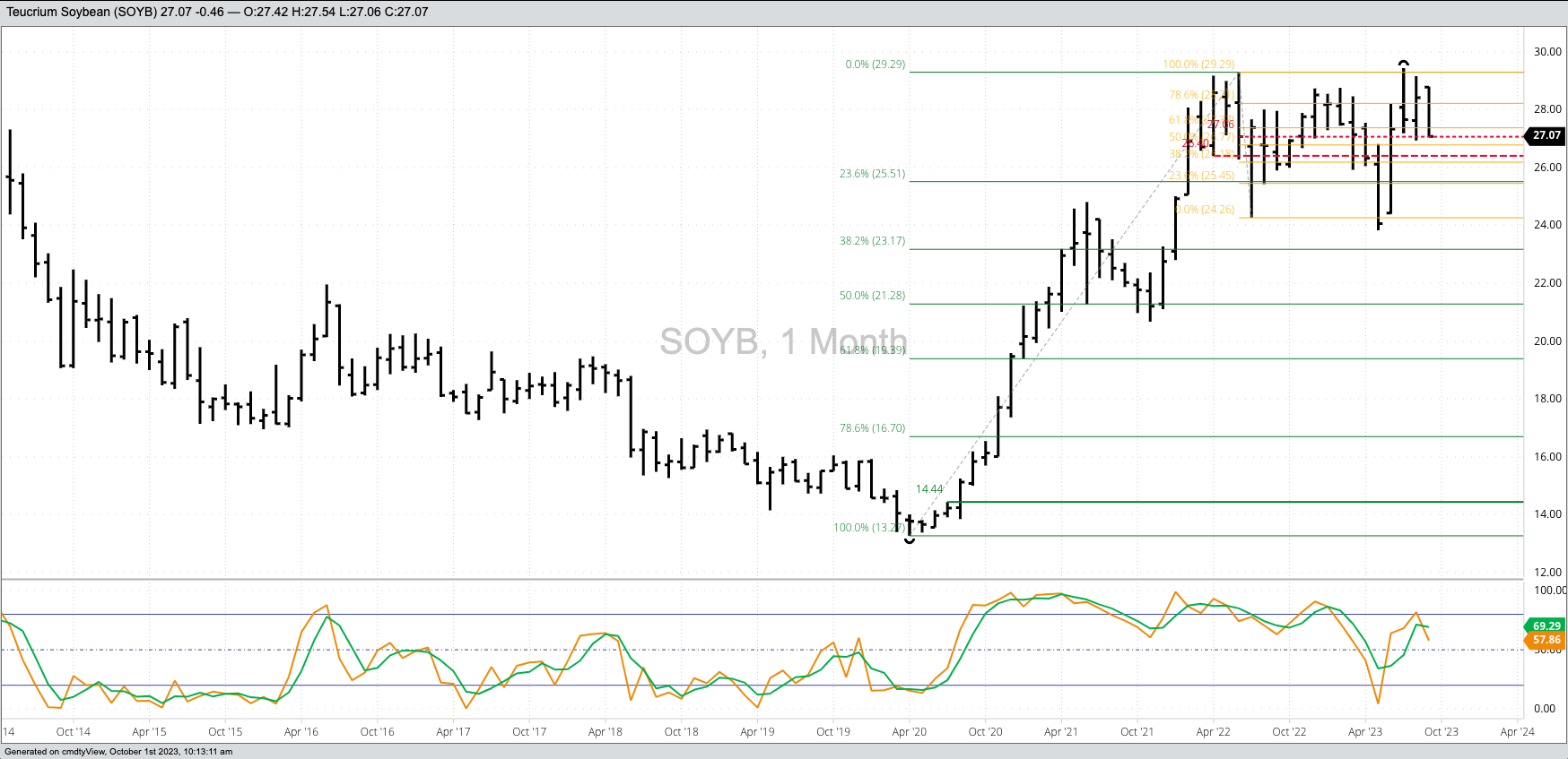 Soybean Cash Index: The monthly close-only chart of the cash index I track for basis and monthly available stocks-to-use continues to show a classic head and shoulder top pattern. The [...]