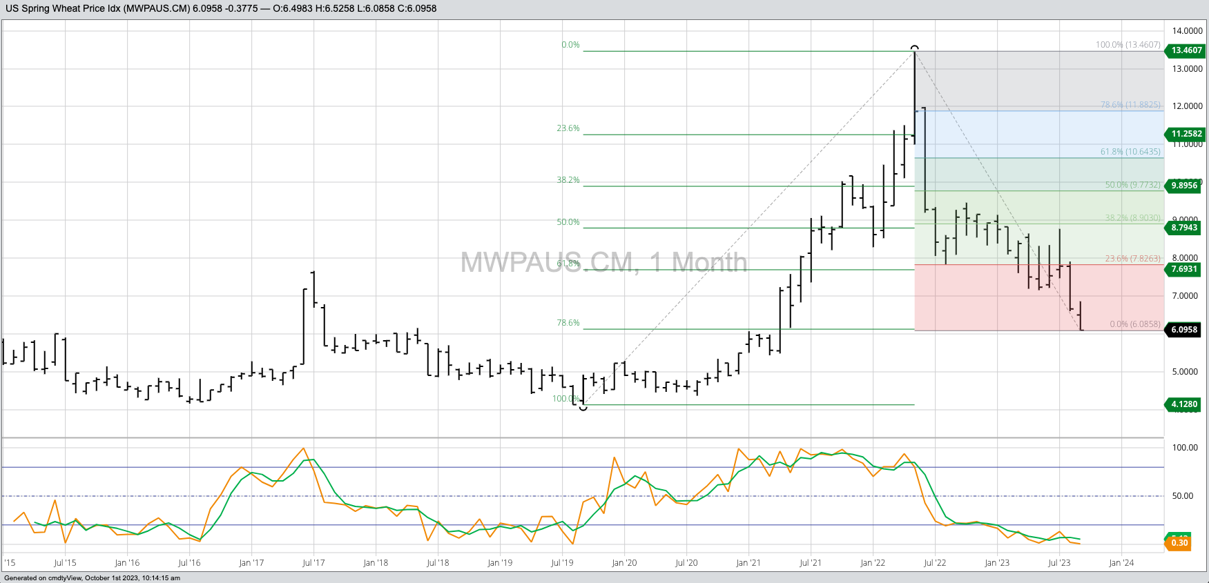 The Barchart National HRW Wheat Price Index (HWPI, weighted national average cash price) extended its major (long-term) downtrend to a low of $5.8669 during September and closed at that mark. [...]