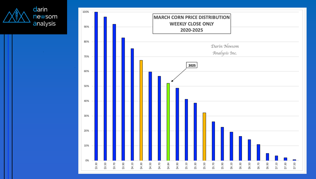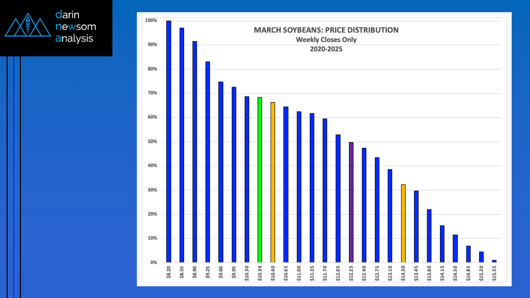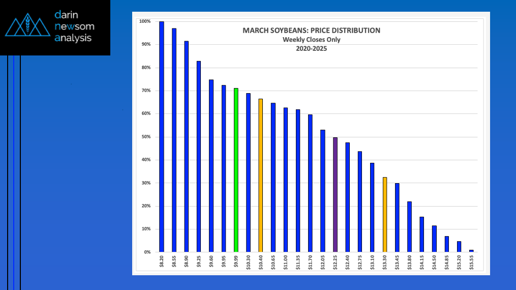 As mentioned in Friday's Morning Commentary, the March soybean contract closed Thursday at $9.99 (green column). This put it in the lower 29% of its 5-year price distribution range based [...]
