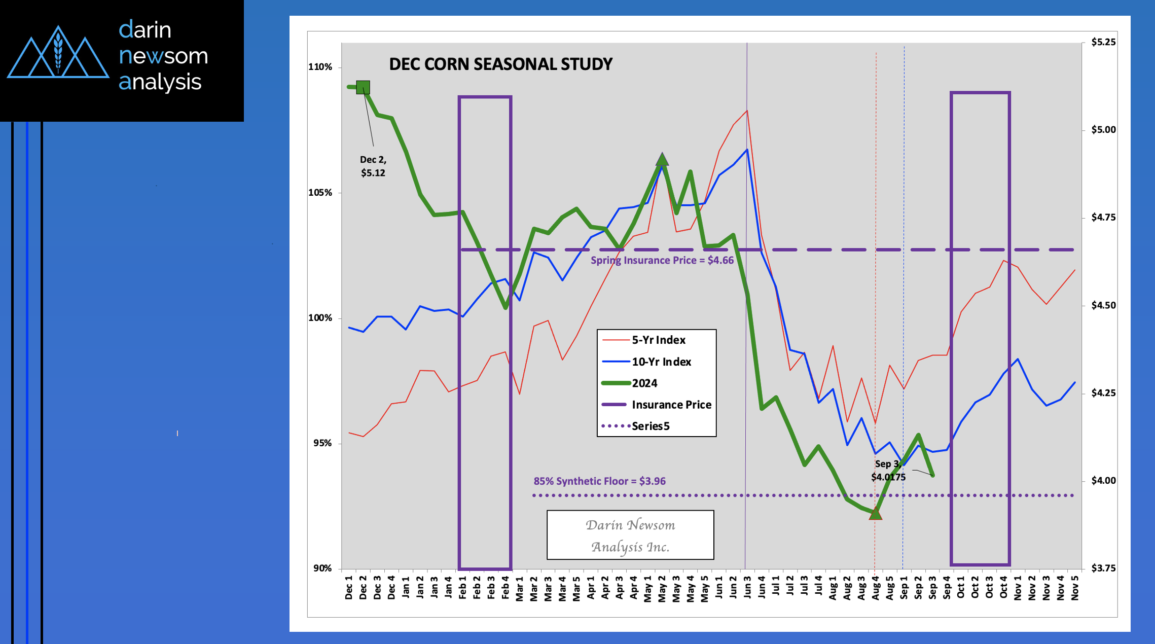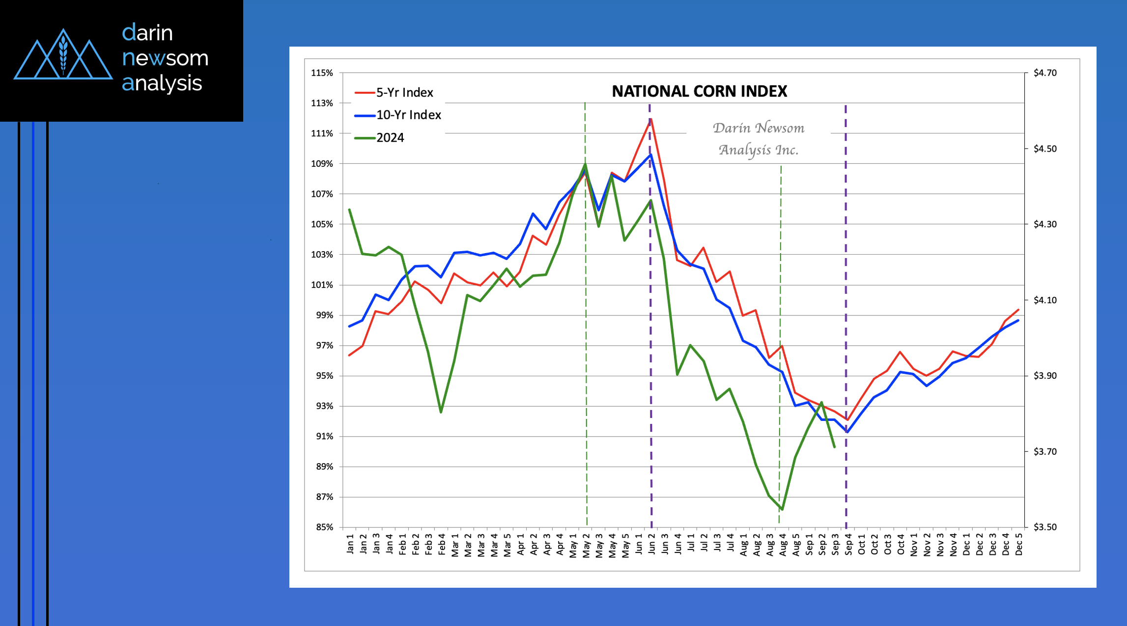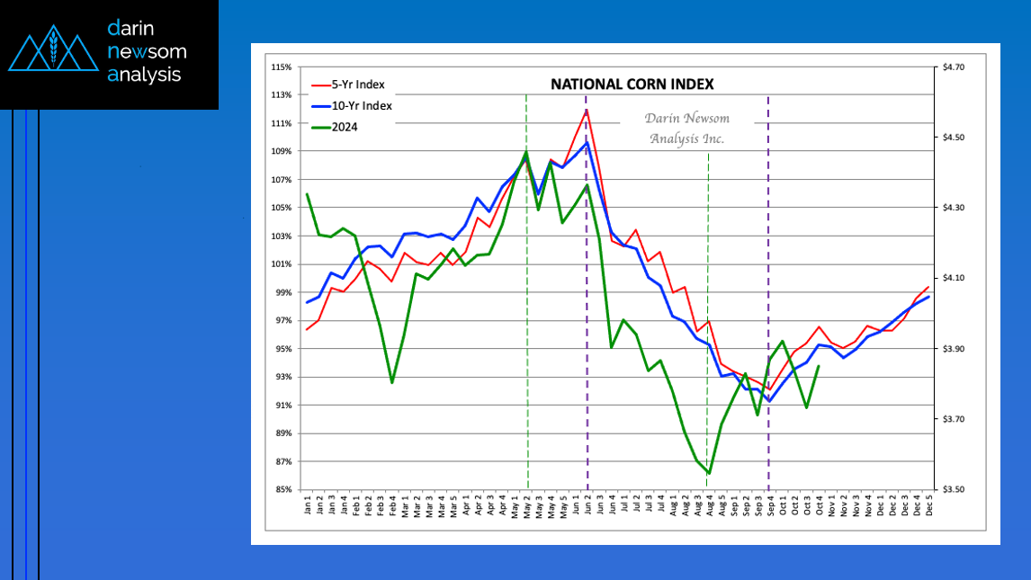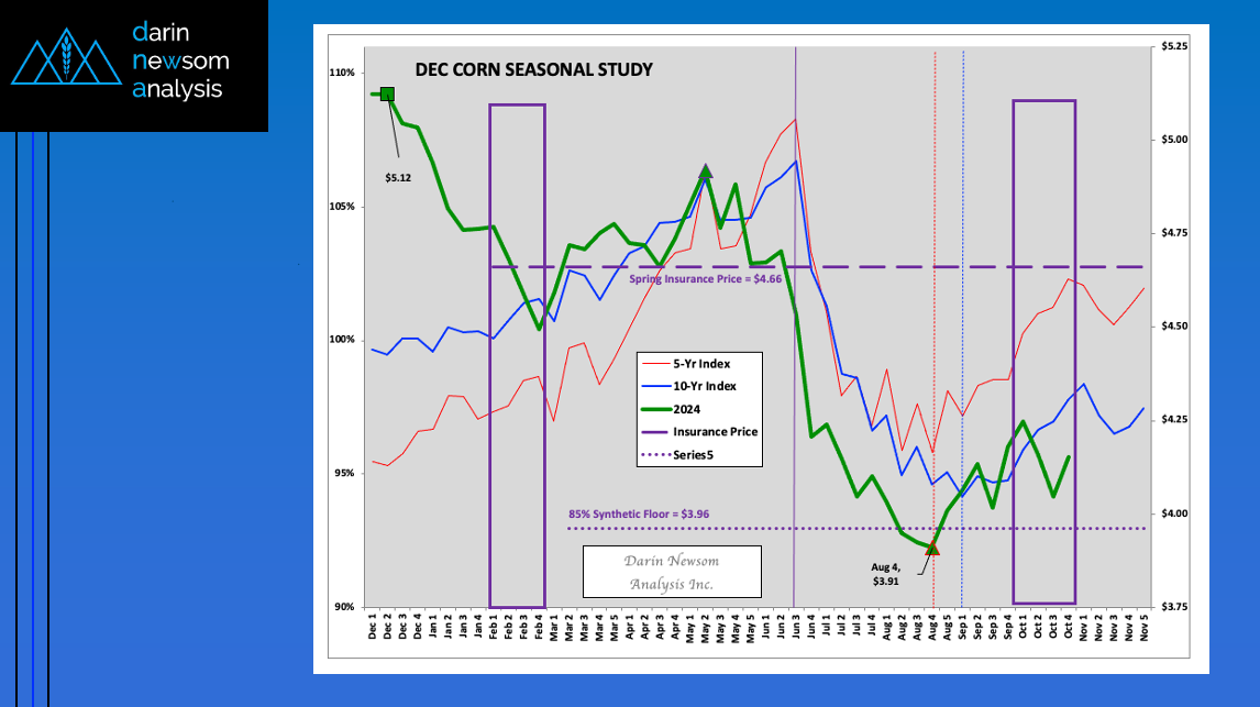 Theoretical Positions: End-users: Intermediate-term (roughly 3 months, or September/October/November) needs could’ve been covered near the recent weekly settlement for the National Corn Index of $3.6850 (Dec24 futures at $4.01). Producers: [...]