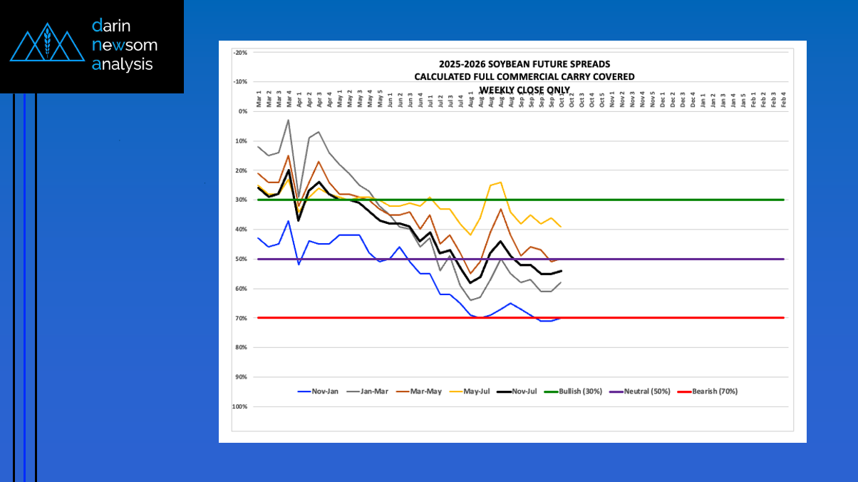 Theoretical Positions: Unhedged bushels can be sold at harvest. Short November futures hedges could've been rolled to January covering 70% or more calculated full commercial carry. Basis tends to firm [...]
