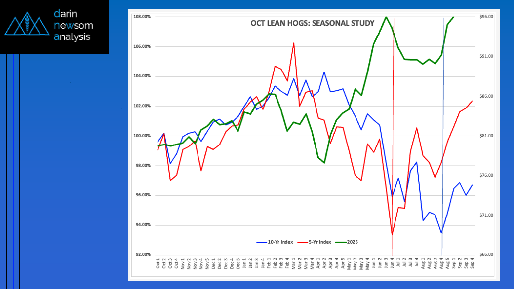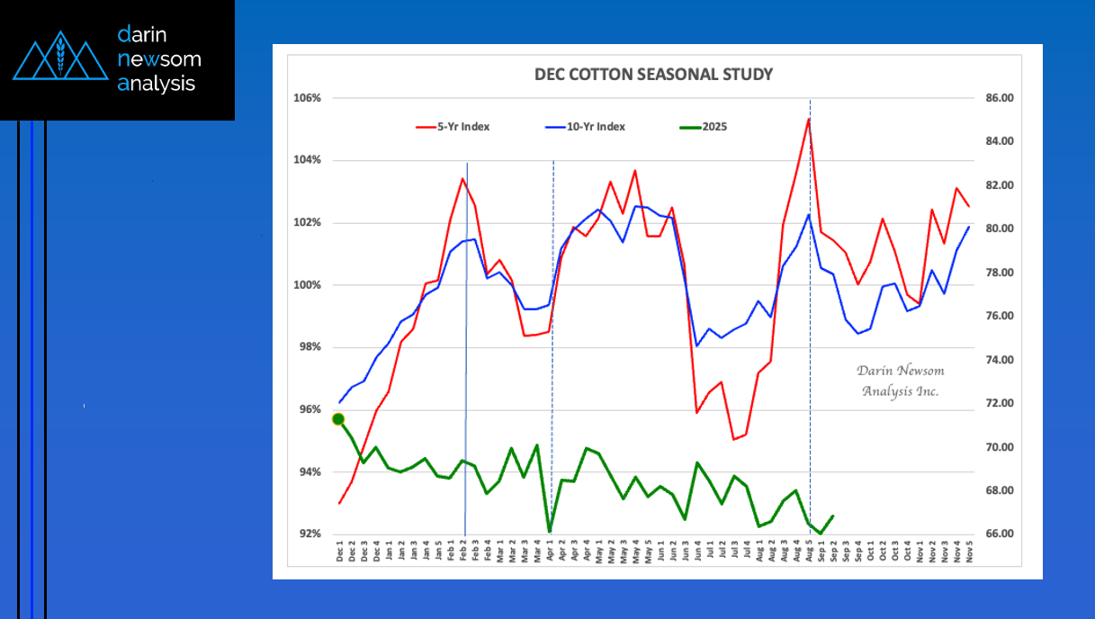 Theoretical Positions: 2025 production should be sold at this point. Seasonal Analysis: Bullish While the 5-year index (red line) shows a normal seasonal low the fourth week of August, fitting [...]