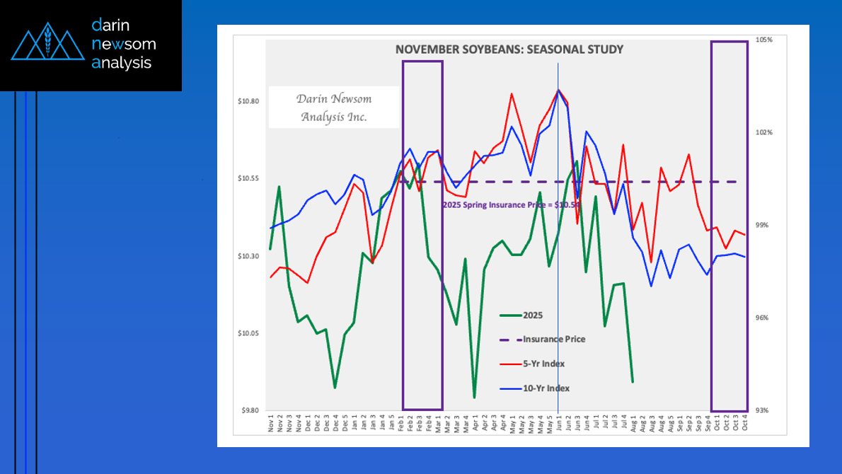 Theoretical Positions: 2025 Harvest: Newly harvested bushels could be sold across the scales given the Cash Index seasonal downtrend (see below) Producers might’ve locked in a small part of expected [...]