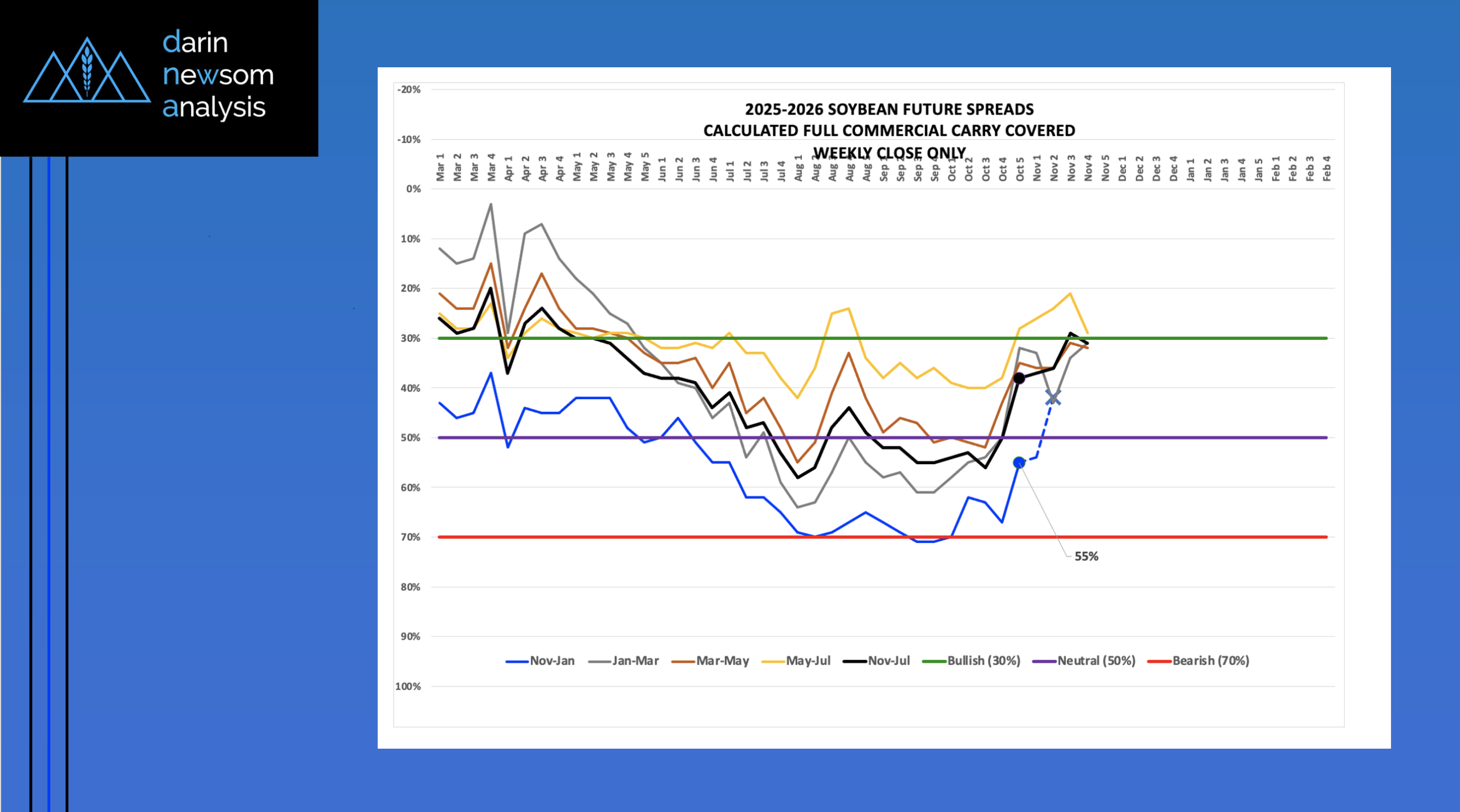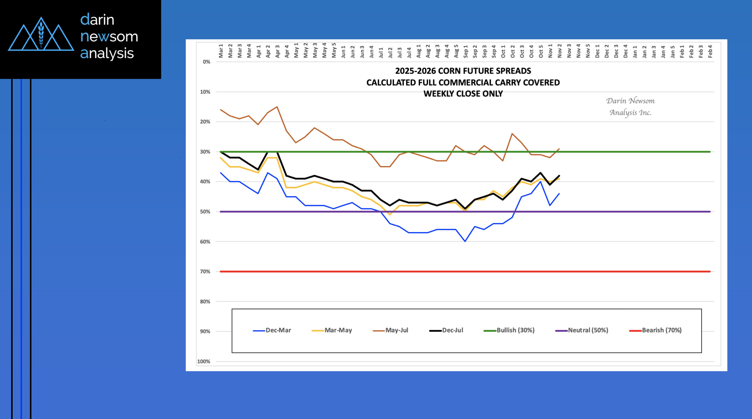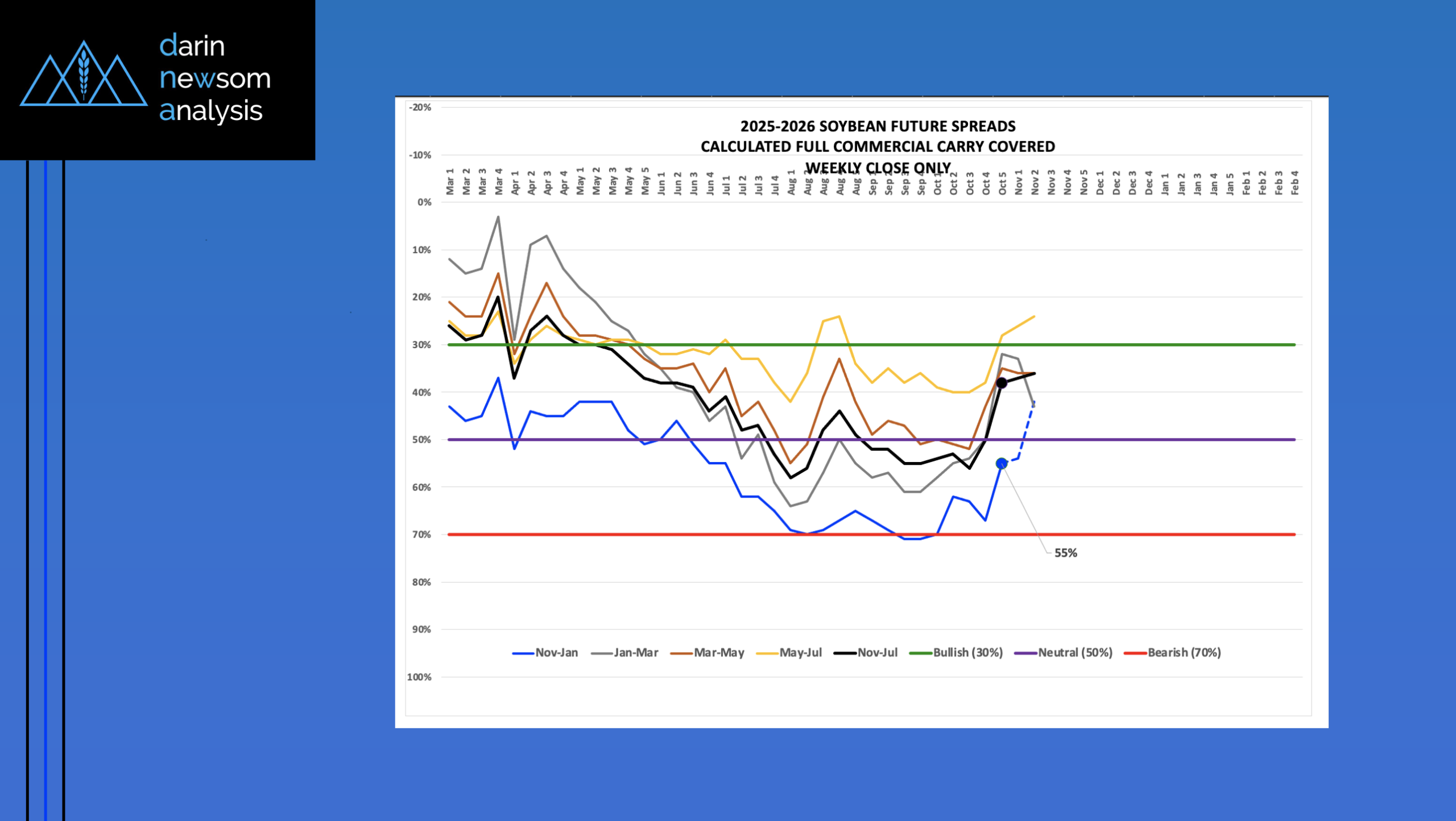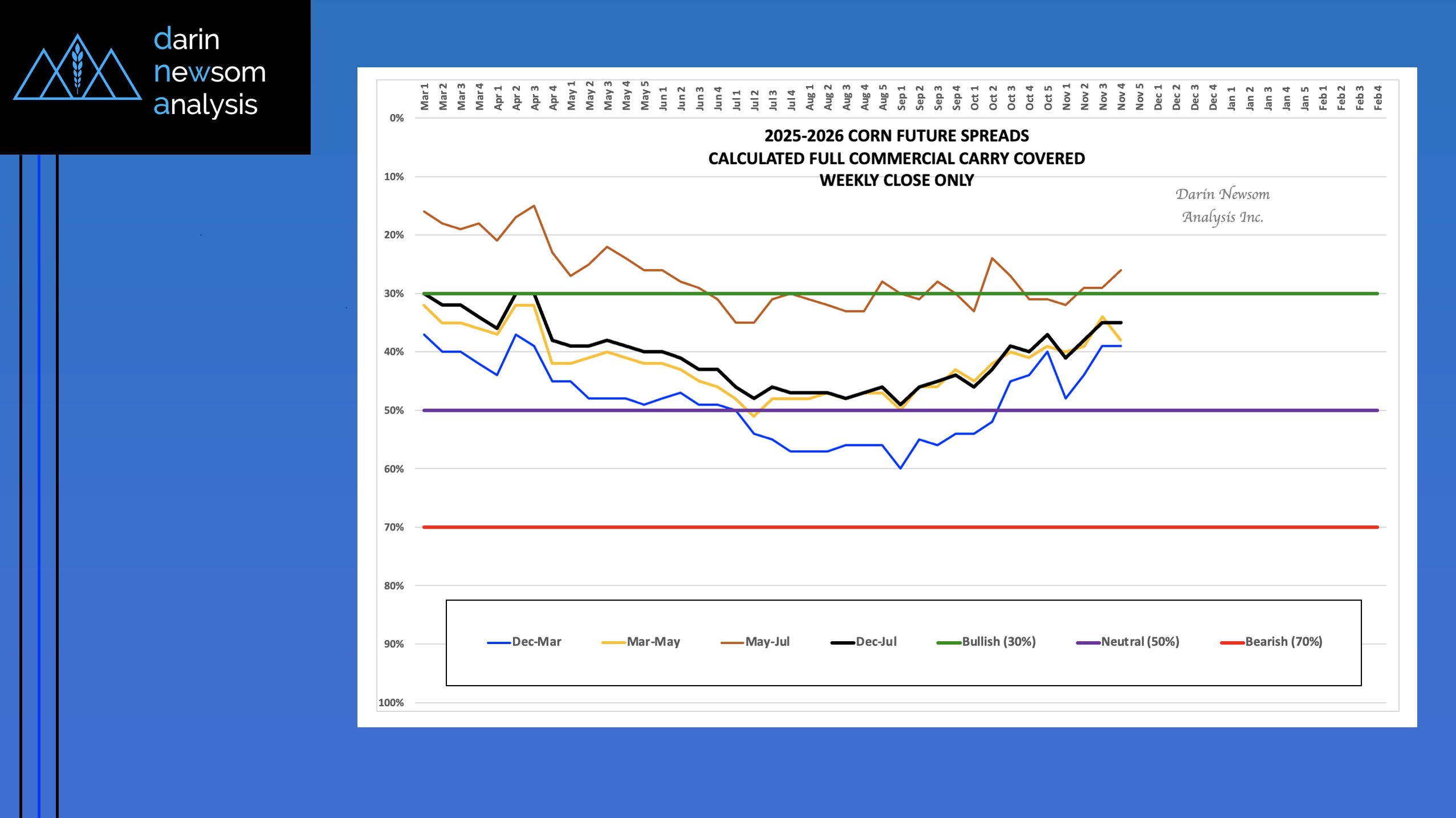 Theoretical Positions: Unhedged bushels can be sold at harvest. Short November futures hedges could’ve been rolled to January covering 70% or more calculated full commercial carry. Basis tends to firm [...]