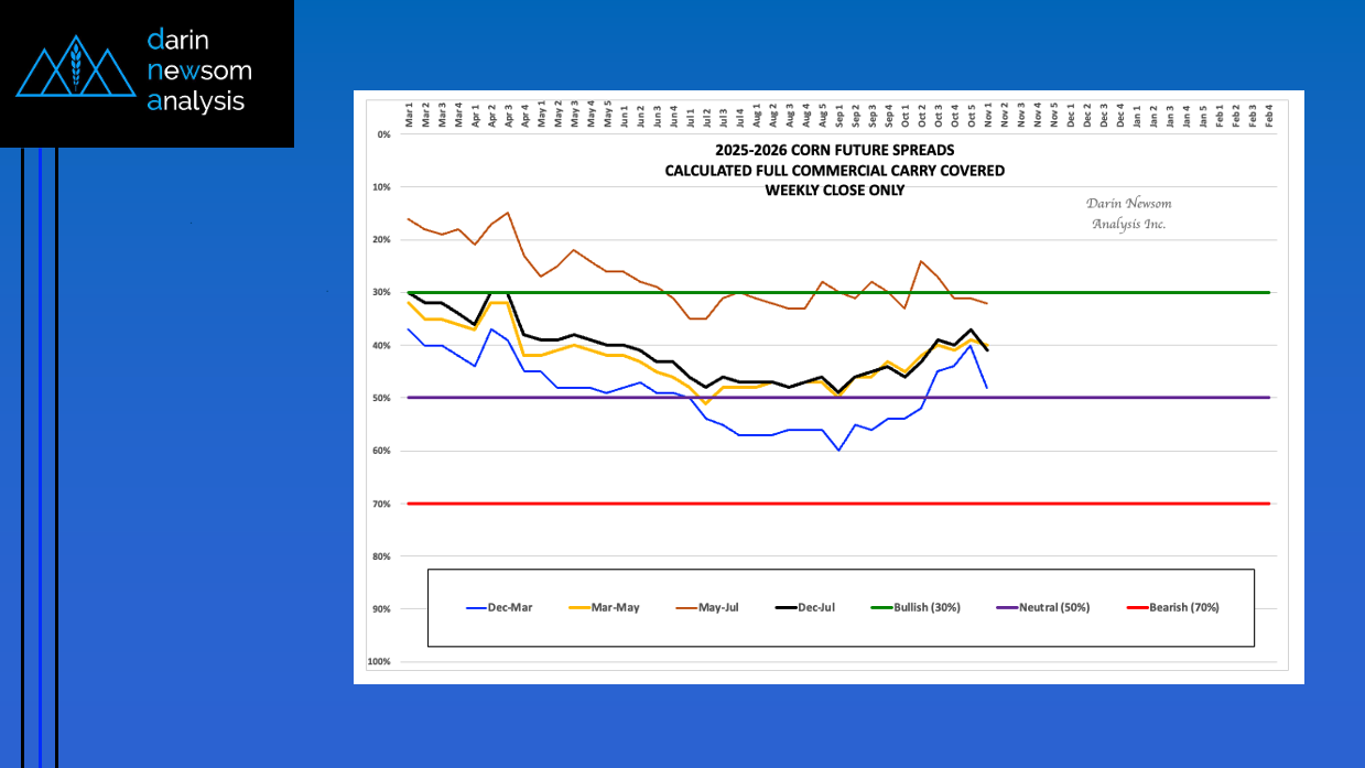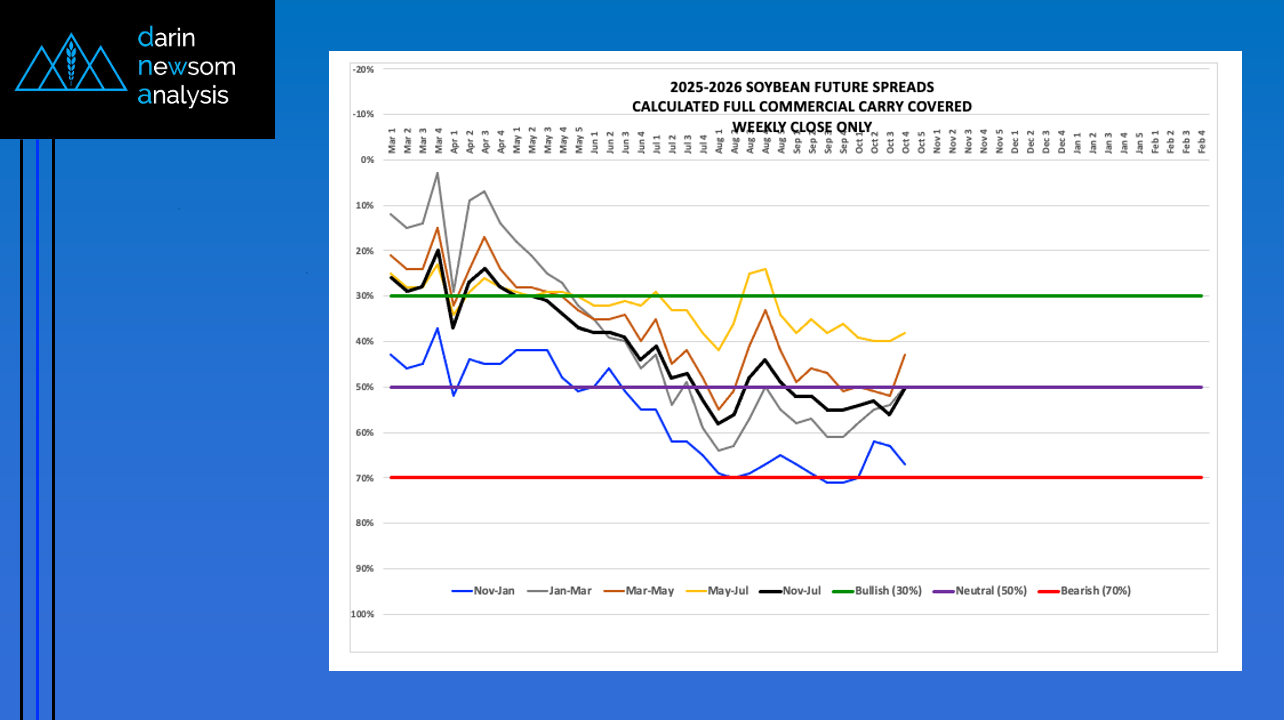 Theoretical Positions: Unhedged bushels can be sold at harvest. Short November futures hedges could’ve been rolled to January covering 70% or more calculated full commercial carry. Basis tends to firm [...]