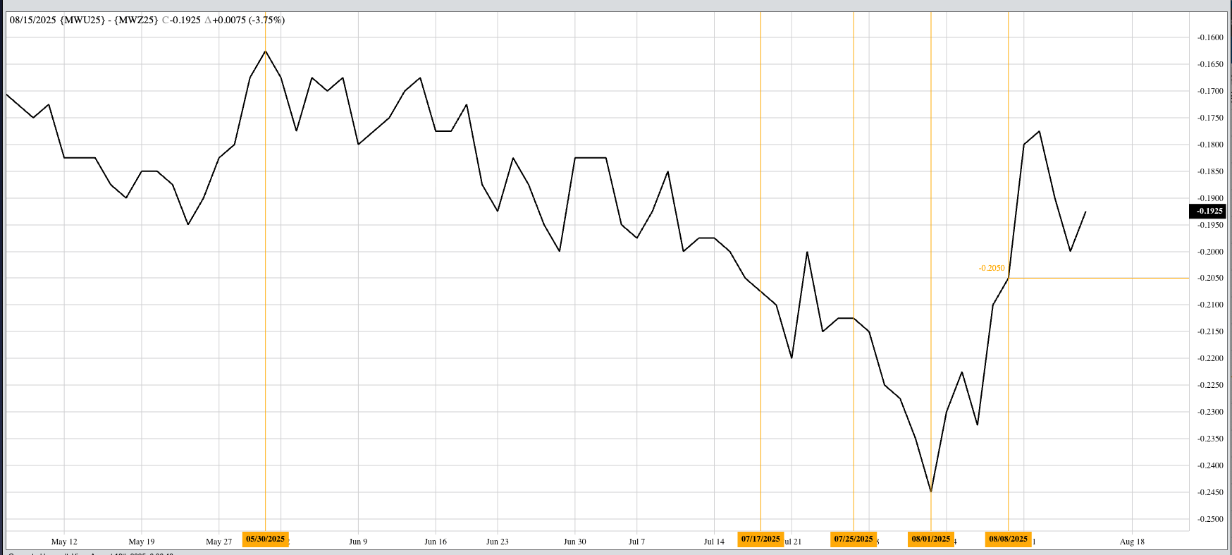 Theoretical Positions: The Sept25 issue closed Friday at $6.1375, down 33.5 cents for the week. The December issue closed at $6.3350, down 33.25 cents. Sell stops were likely triggered below [...]