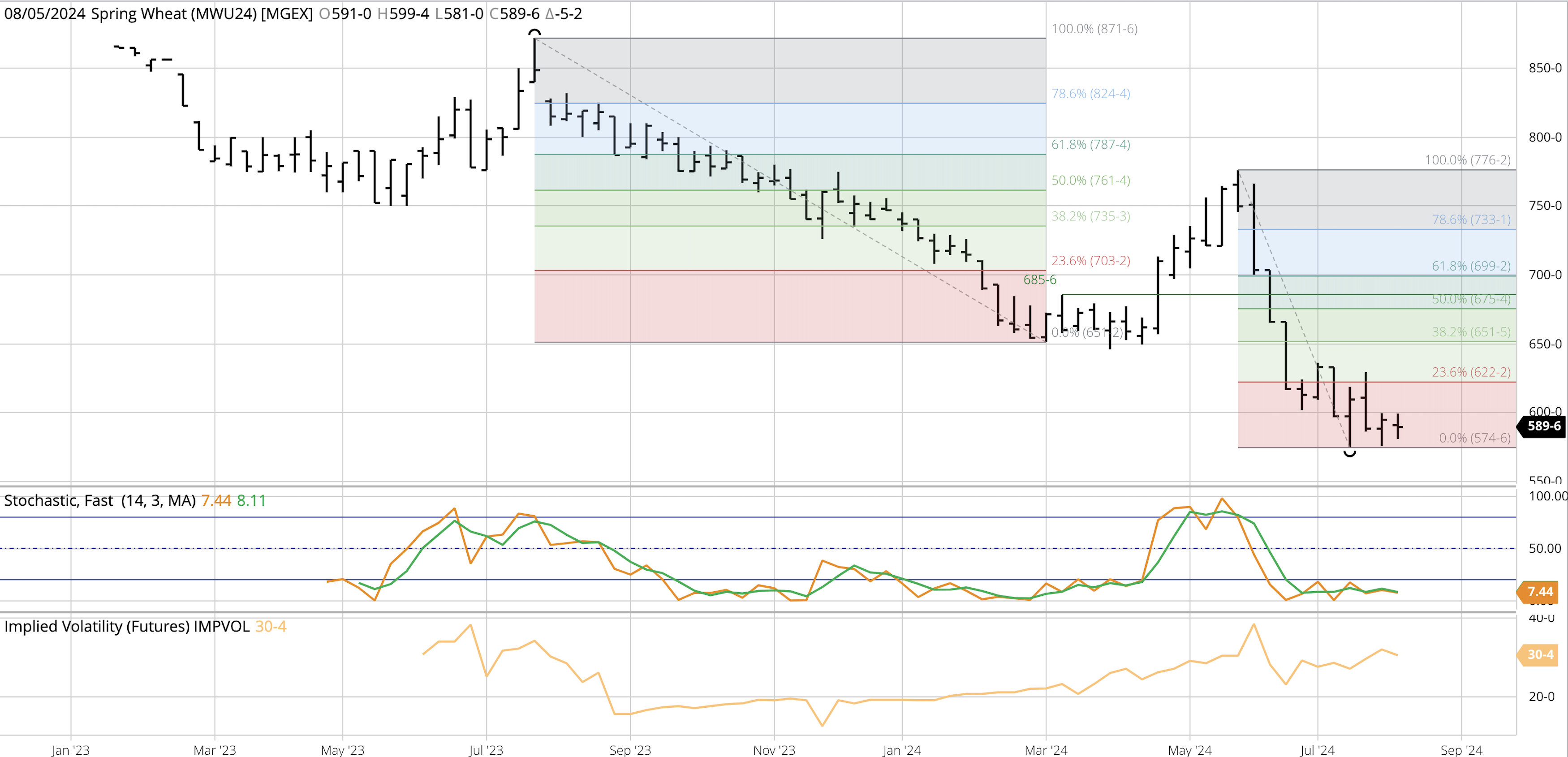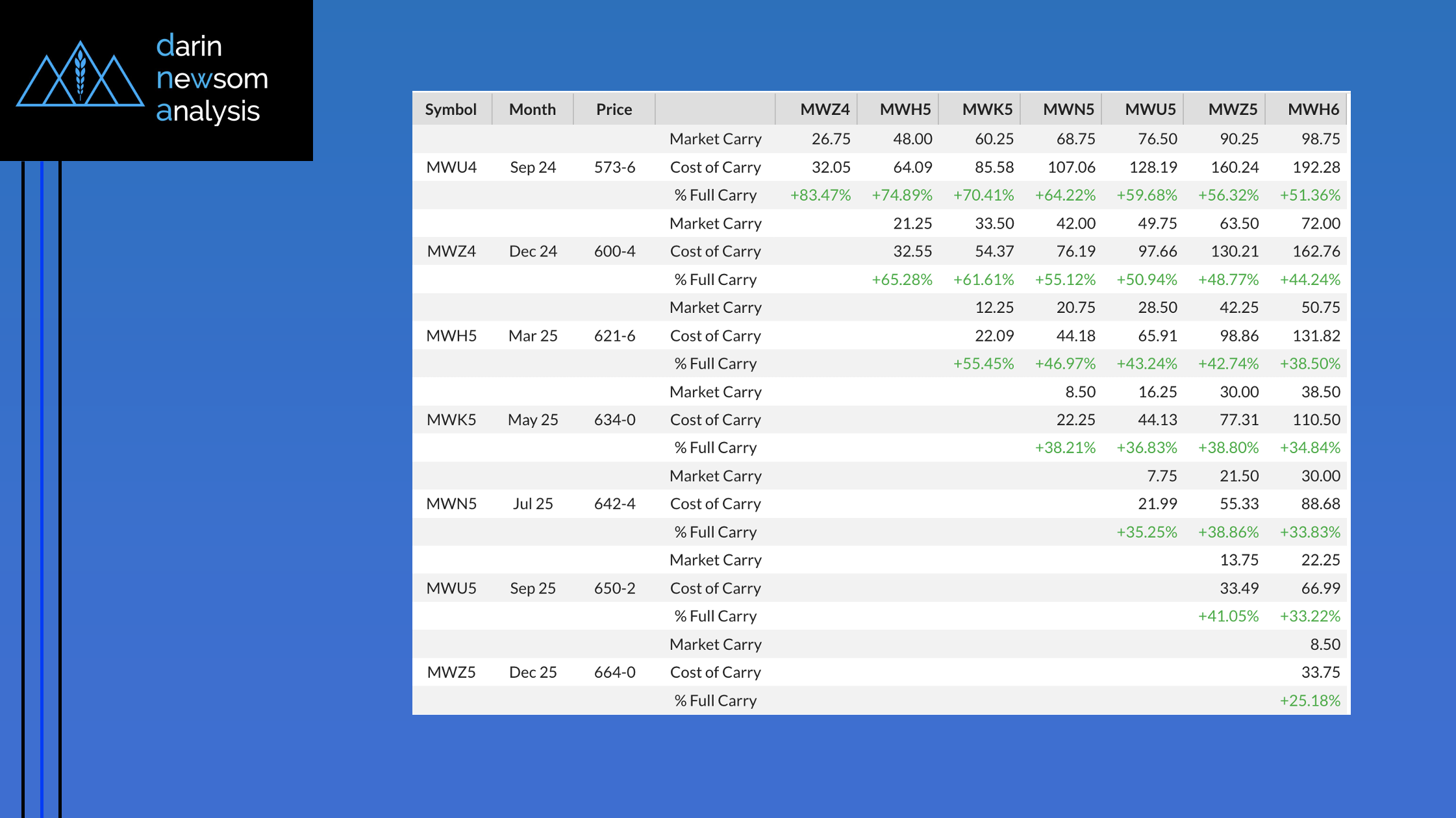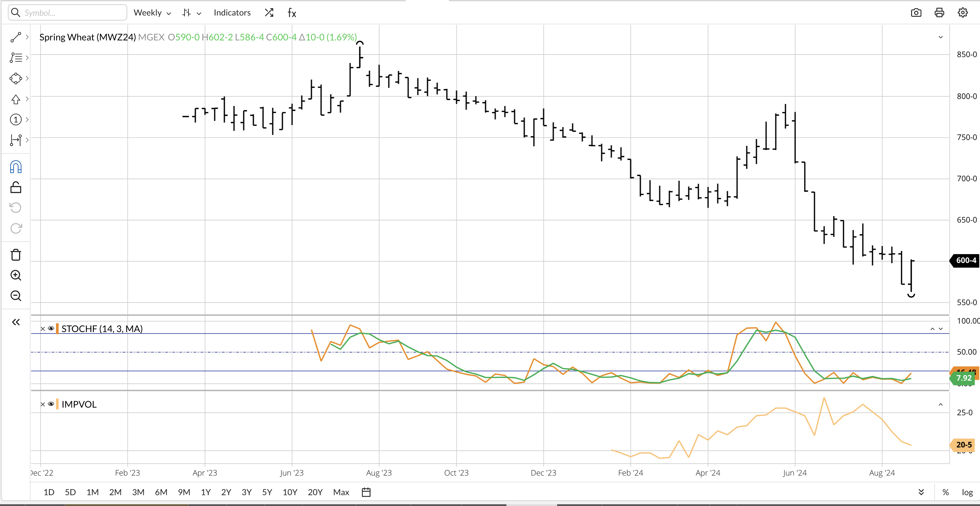 Theoretical Positions: 2024 SRW wheat production has likely been sold. Based on the bullish spike reversal at the end of August, Dec24 futures could've been bought near $5.5150. If so, [...]