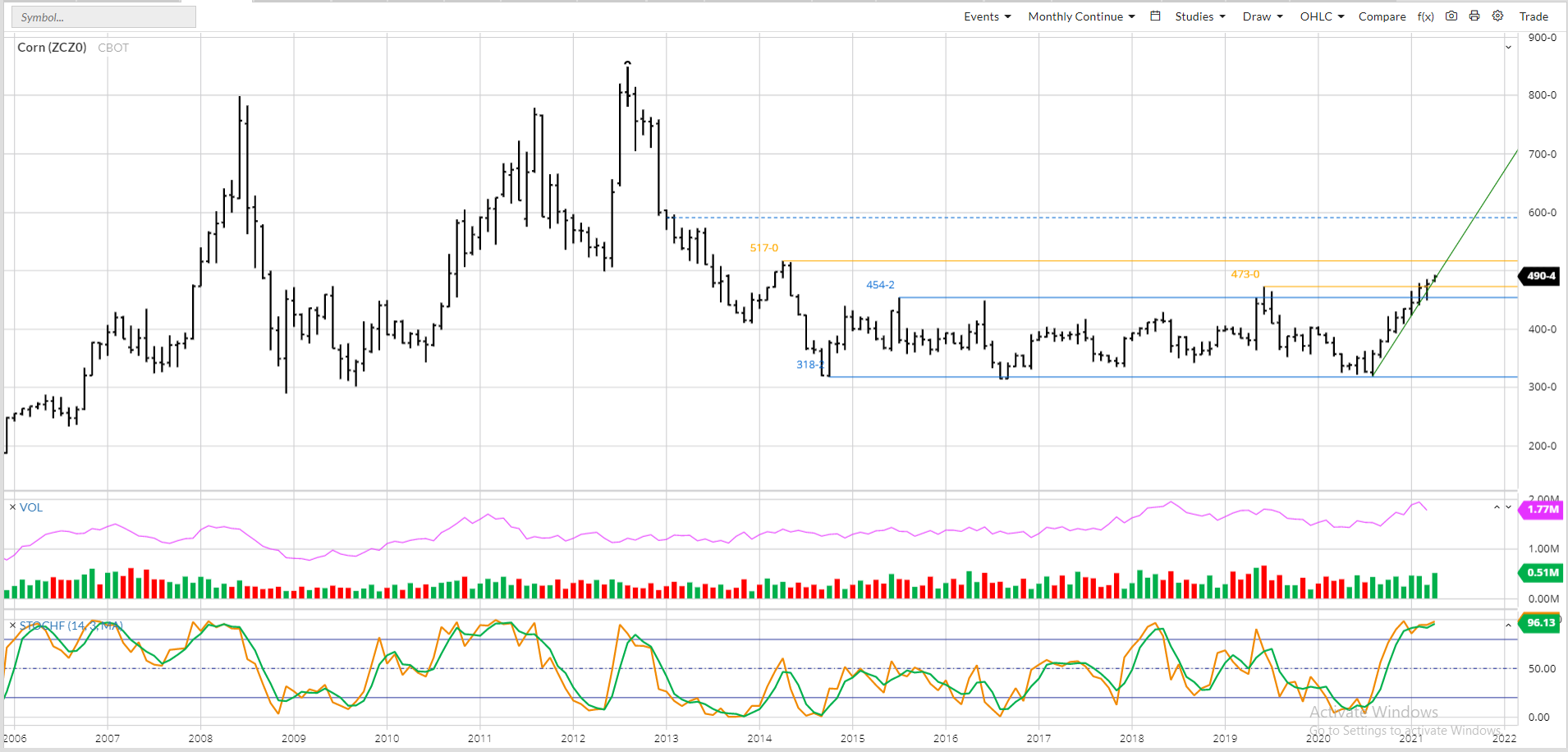 As mentioned in Seasonal Analysis Monday morning, the December 2021 contract has extended its major (long-term) uptrend to a high of $4.93 in early April, despite monthly stochastics approaching 100% reflecting a sharply overbought situation. Still, the contract is chugging along with the next upside target the high of $5.17 from April 2014, posted by the 2014 contract. As I’ve discussed a number of times (most recently in Monday’s Seasonal Analysis), there is a loose correlation between the 2021 and 2014 contracts based on previous marketing year stocks-to-use. However, at the end of March my 2020-2021 calculation of available stocks-to-use moved past what we saw for ending stocks-to-use as the 2013-2014 marketing year came to a close, meaning the Dec 2021 issue could extend its rally beyond the 2014 peak. Based on Newsom’s Rule #6 (Fundamentals win in the end.), it will all come down to activity in futures spreads with both the Dec-March spread and Dec-to-July forward curve still covering a bullish level of calculated full commercial carry.