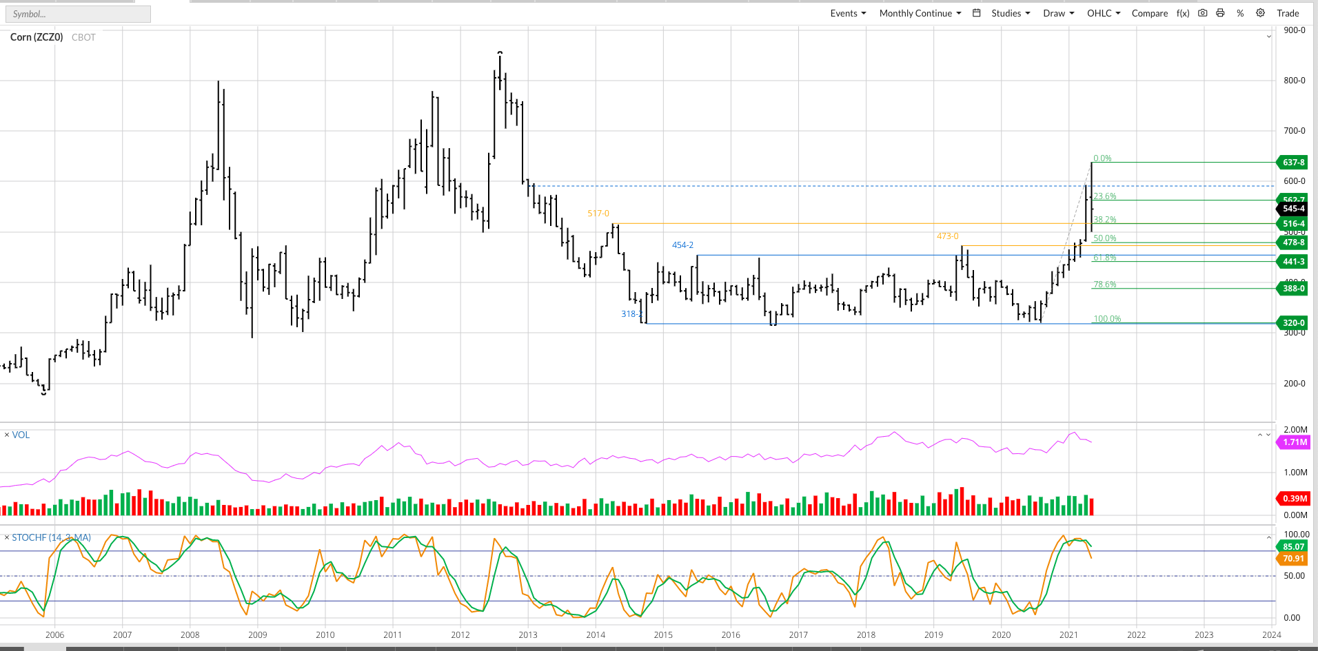 Like so many other markets in the grain and oilseed complex, the December 2021 corn contract looks to have established a bearish spike reversal on the continuous monthly chart for Dec corn only. May saw the 2021 issue post a high of $6.38 before falling to a low of $5.0025 and closing at $5.4550, down 18.25 cents from April’s close of $5.6375. The end of April was also interesting in that the close was far enough off the monthly high of $5.93 for monthly stochastics to establish a bearish crossover above the overbought 80% level. Given this, May’s move now looks to be confirmation of a new major (long-term) downtrend signaled by the previous month’s crossover, the end of the line for the cog train’s uphill journey.