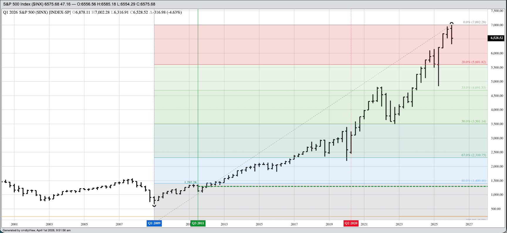 The S&P 500 ($INX) had a bearish first quarter (January through March), closing March at 6,528.52, down 316.98 points (4.6%) from last December’s settlement. Also note the Index completed a bearish key reversal on its quarterly chart indicating the major (long-term) trend has turned down. Theoretical Positions: Investors are likely moving money to other sectors.