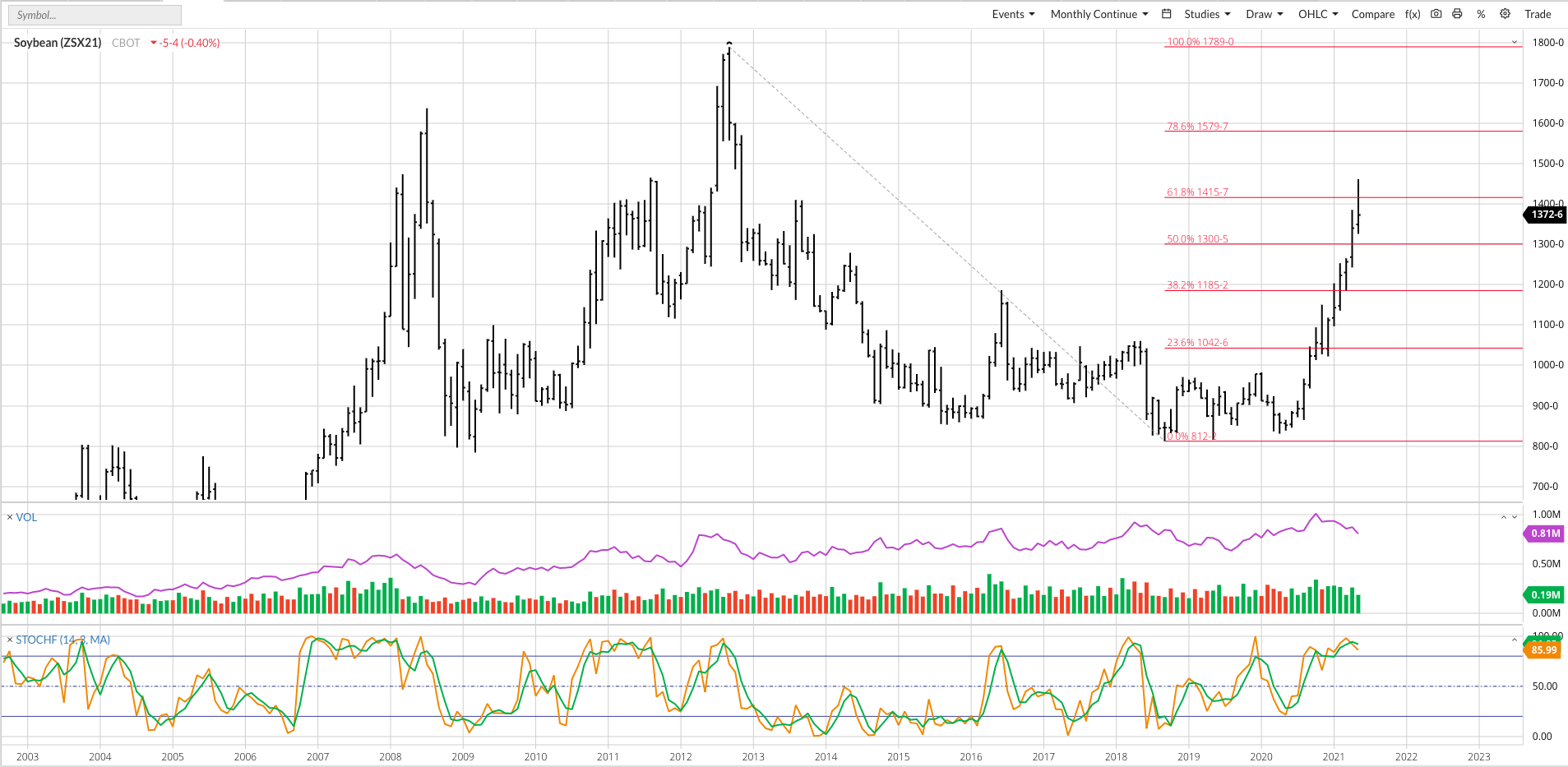 There is always one market that isn’t like all the rest, and in the case of the grain and oilseed complex the contract is November soybeans. the continuous monthly chart for the November contract shows the 2021 issue posted a new high for the ongoing major (long-term) uptrend of $14.61 before falling back to close at $13.7275. This was enough for monthly stochastics to establish a bearish crossover above the overbought level of 80% at the end of the month, a signal the major trend is set to turn down. However, the difference between November soybeans and nearly every other monthly chart for grain and oilseeds is that it still closed higher for the month, up 33 cents from April’s close of $13.3975. This makes sense given the market’s long-term bullish fundamentals, indicated by its inverted forward curve. What we know at the end of May is November soybeans are in position to establish a new major downtrend, but have not confirmed a turn to a new trend yet. What shape that confirmation comes in is hard to guess at this time, though for now I would expect to see the contract start to consolidate below the May 2021 high.