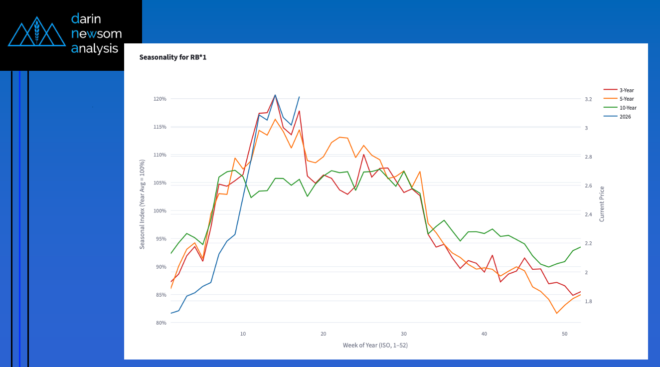 RBOB Gasoline Darin Newsom2026-04-26T08:00:56-05:00April 26th, 2026|Seasonal Analysis| Username Password Remember Me Forgot Password Related Posts Feeder Cattle April 24th, 2026 May-August Feeder Cattle Futures Spread March 17th, 2026 Nov Soybean/Dec Corn 2026: Final February 27th, 2026 Soybean Meal February 22nd, 2026