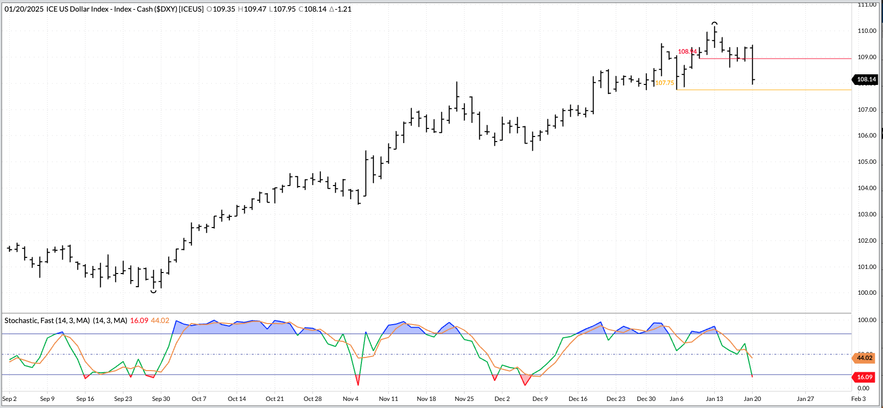 US Dollar Index Daily Darin Newsom2025-01-20T09:54:14-06:00January 20th, 2025|Charts| Username Password Remember Me Forgot Password Related Posts November Soybeans Daily April 22nd, 2026 July Corn Daily Close Only April 15th, 2026 June Live Cattle Weekly April 10th, 2026 Soybean Meal Forward Curve April 9th, 2026