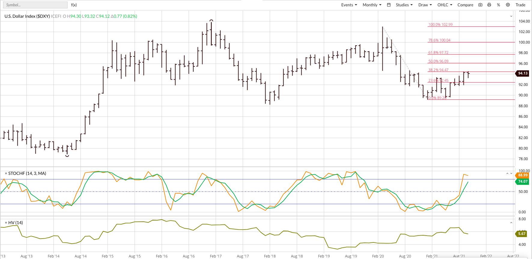 Ultimately, I still see the USDX moving higher with a major target area between 96.09 and 97.72, the 50% and 61.8% retracement levels of the previous downtrend from 102.99 (March 2020) through the low of 89.20 (January 2021).